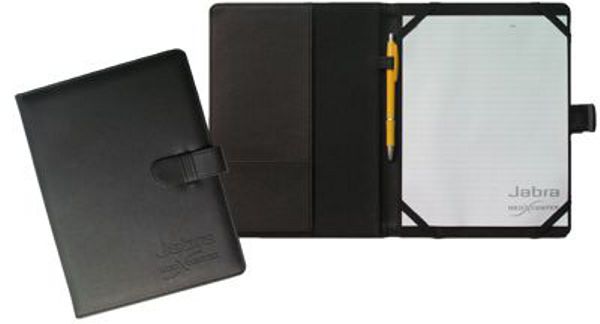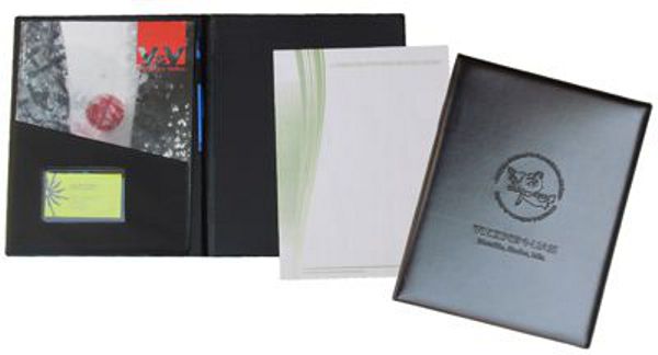 Carpeta para congresos mod. CC03 en curpiel sellado , medidas de 30 X 23.5 X 1.5 cms. Con alma de cartón , hule espuma en portada con papelera, porta-pluma y porta-block