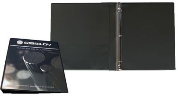 Carpeta panoramica sellada mod. CC09 con herraje de 3 argollas de ¾” circular fijo en la contraportada con capacidad de 100 hojas bond de 36 kgs.